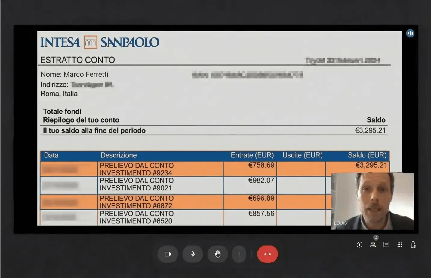 Marco Ferretti: « Esatto. Il team di Report mi ha proposto di testare la piattaforma . Hanno raccolto 275 euro per me – il deposito minimo richiesto per la registrazione. Poi mi hanno accompagnato nella compilazione del modulo sul sito, nella verifica dell'identità e nel deposito. La verifica avviene tramite una chiamata telefonica con un manager – è obbligatoria, non si può saltare, altrimenti si deve ricominciare da capo. »